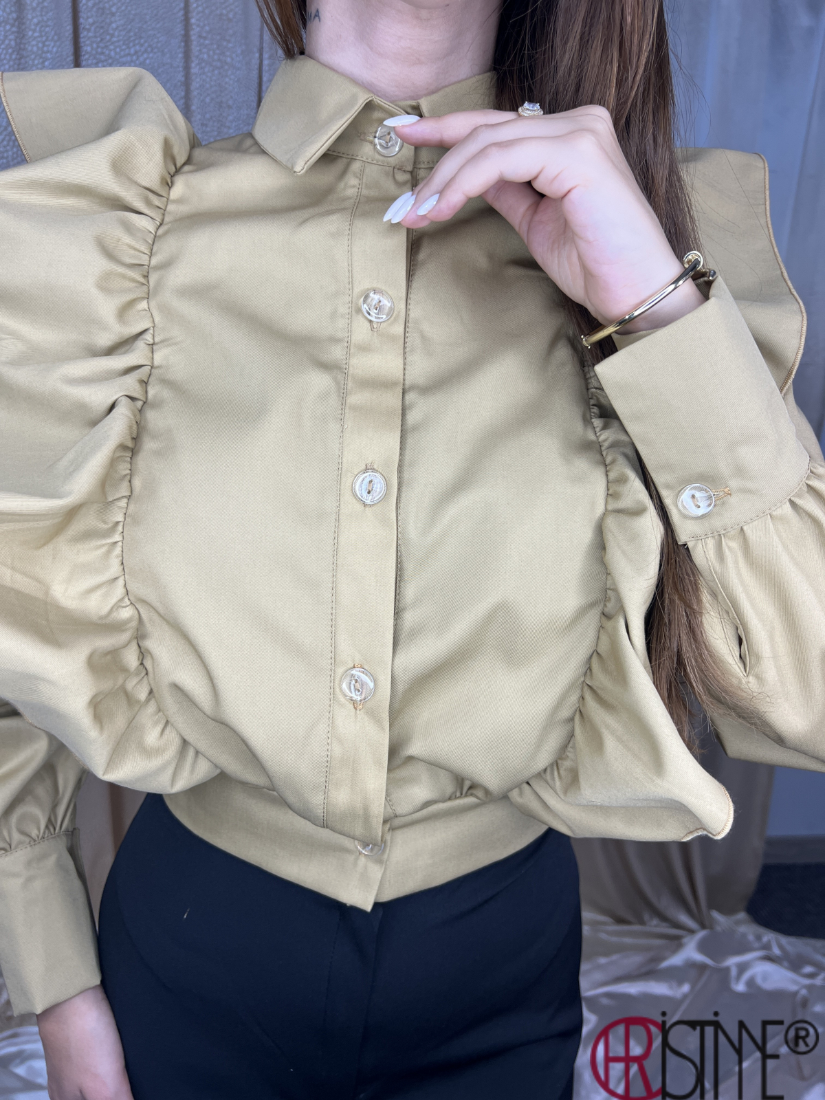 Introduceți o notă de romantism în garderoba dumneavoastră cu această cămașă fermecătoare. Cu volane delicate, această cămașă adaugă un detaliu feminin și rafinat.Mânecile bufante aduc un aer boem și contemporan, oferindu-vă o senzație de lejeritate și stil. Gulerul și manșetele completează cu eleganță designul, aducând o notă clasică și sofisticată.Această cămașă cu volane este alegerea ideală pentru a vă exprima stilul personal și pentru a aduce o notă de eleganță în orice ocazie. Cu o potrivire confortabilă și un design fermecător, veți străluci în fiecare moment.