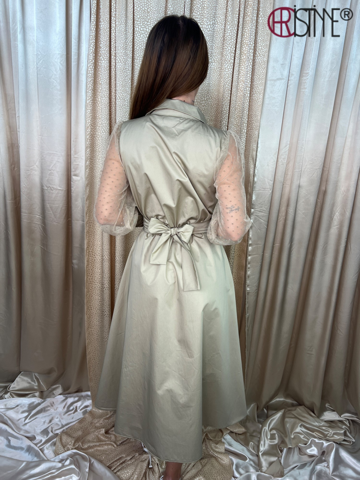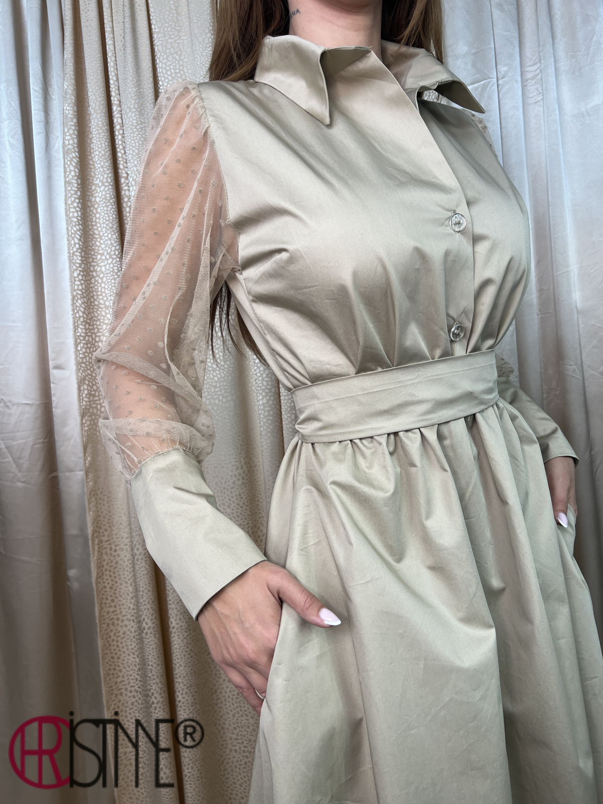 Aceasta rochie este o adevarata bijuterie in garderoba ta. Cu partea de sus in stil camasa adauga un aer elegant si lejer. Manecile din tull cu mansete late aduc un deteliu romantic si delicat. Croiala evazata confera rochiei un aspect usor si fluid, in timp ce elasticul in talie si cordonul permit o potrivire perfecta si comoda. In fata este scurta si plina de energie, in timp ce spatele lung adauga un element de dramatism si rafinament. Acesta rochie este pefecta pentru o varietate de evenimente, de la petreceri la seri romantice.Cu aceasta alegere, vei atrage cu sigurata privirile si vei arata absolut fermecator.