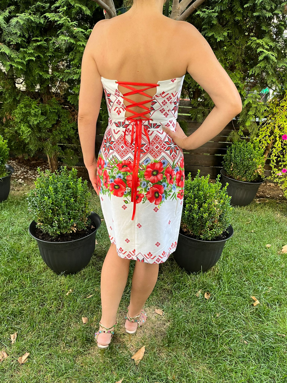 Corsetul se inchide prin corsetare la spate si fusta cu fermoar ascuns la spate.