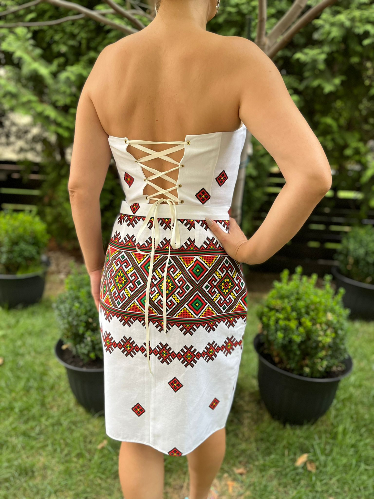 Corsetul se inchide prin corsetare la spate si fusta cu fermoar ascuns la spate.