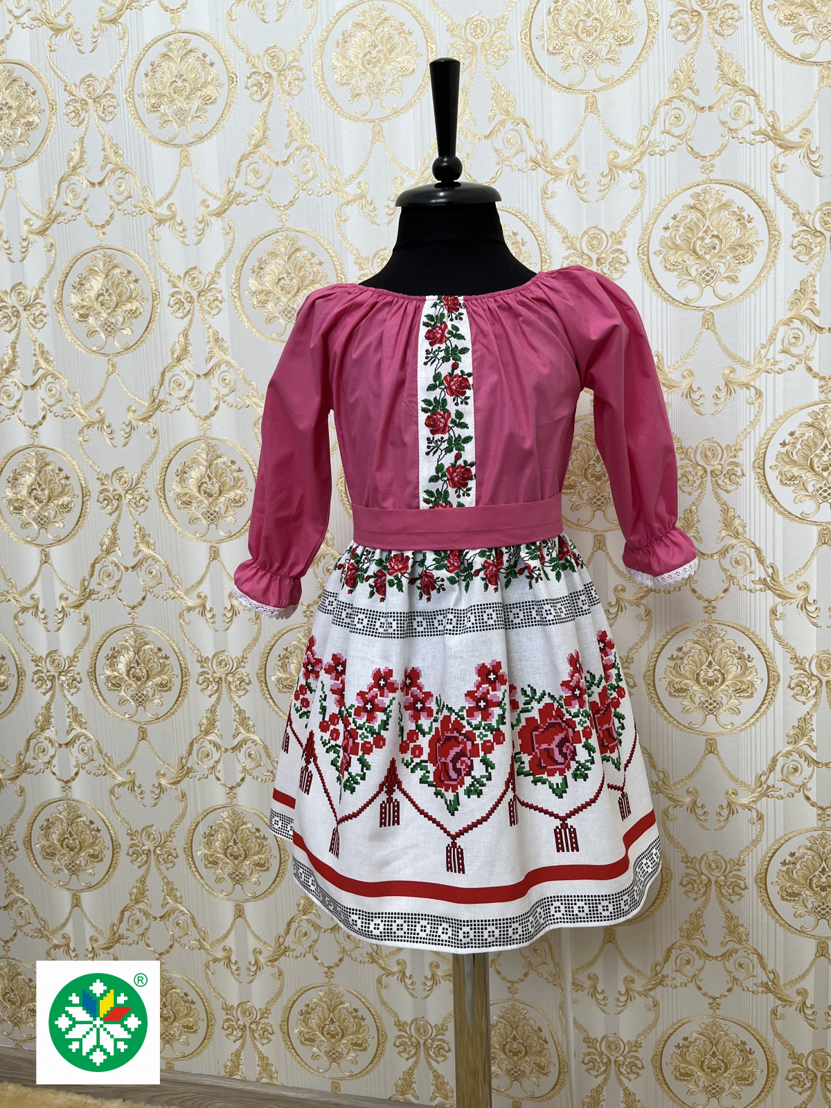 Rochie pentru fete, din panza 100% bumbac , in volane, cu motive traditionale, potrivita pentru orice ocazie.
