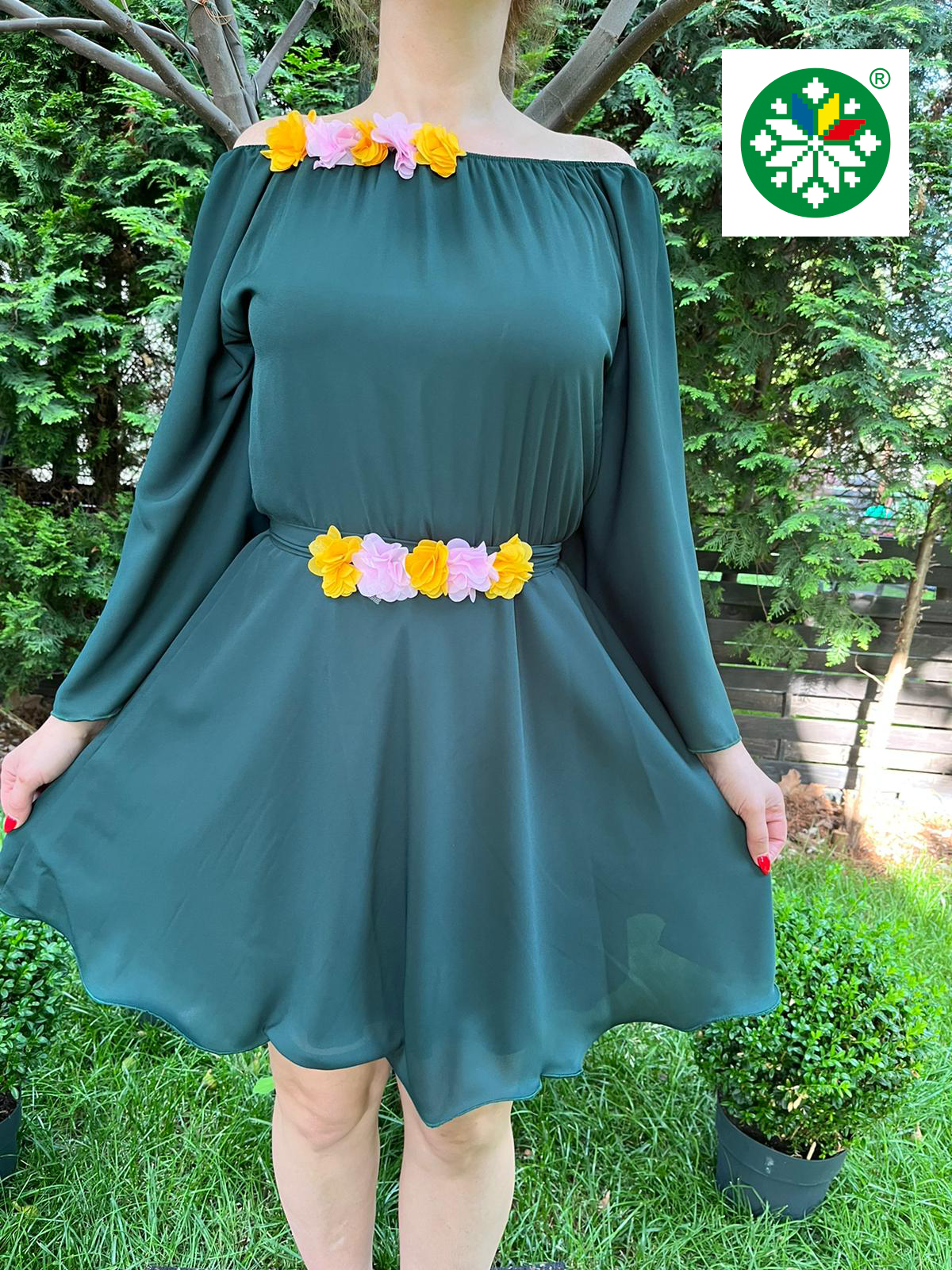 Rochie eleganta si vaporoasa din voal, accesorizata cu flori 3D, potrivita pentru orice ocazie.