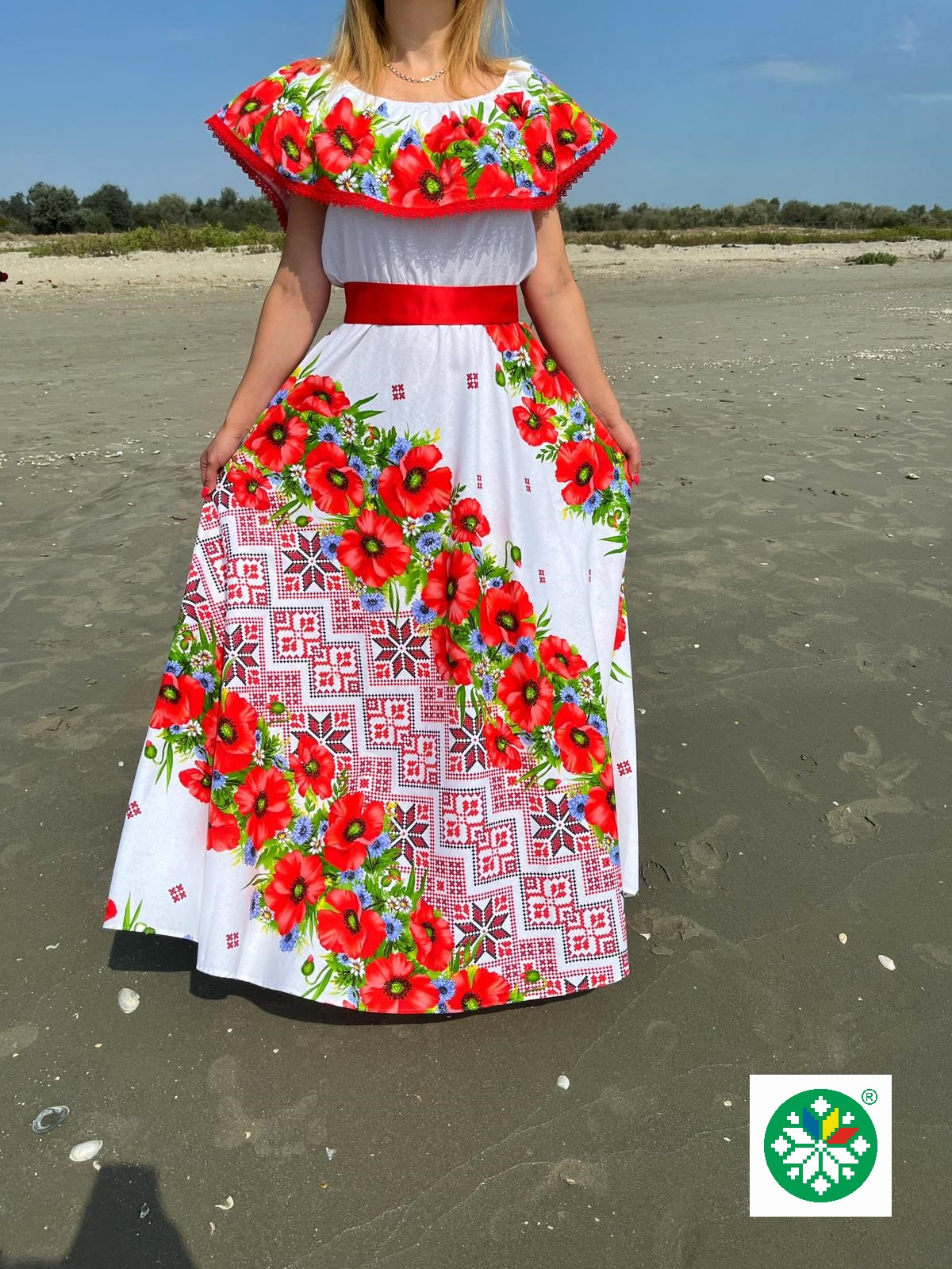 Rochie din panza cu motive tradititionale, cu volan la decolteu, volanul este accesorizat cu broderie, potrivita pentru orice ocazie.