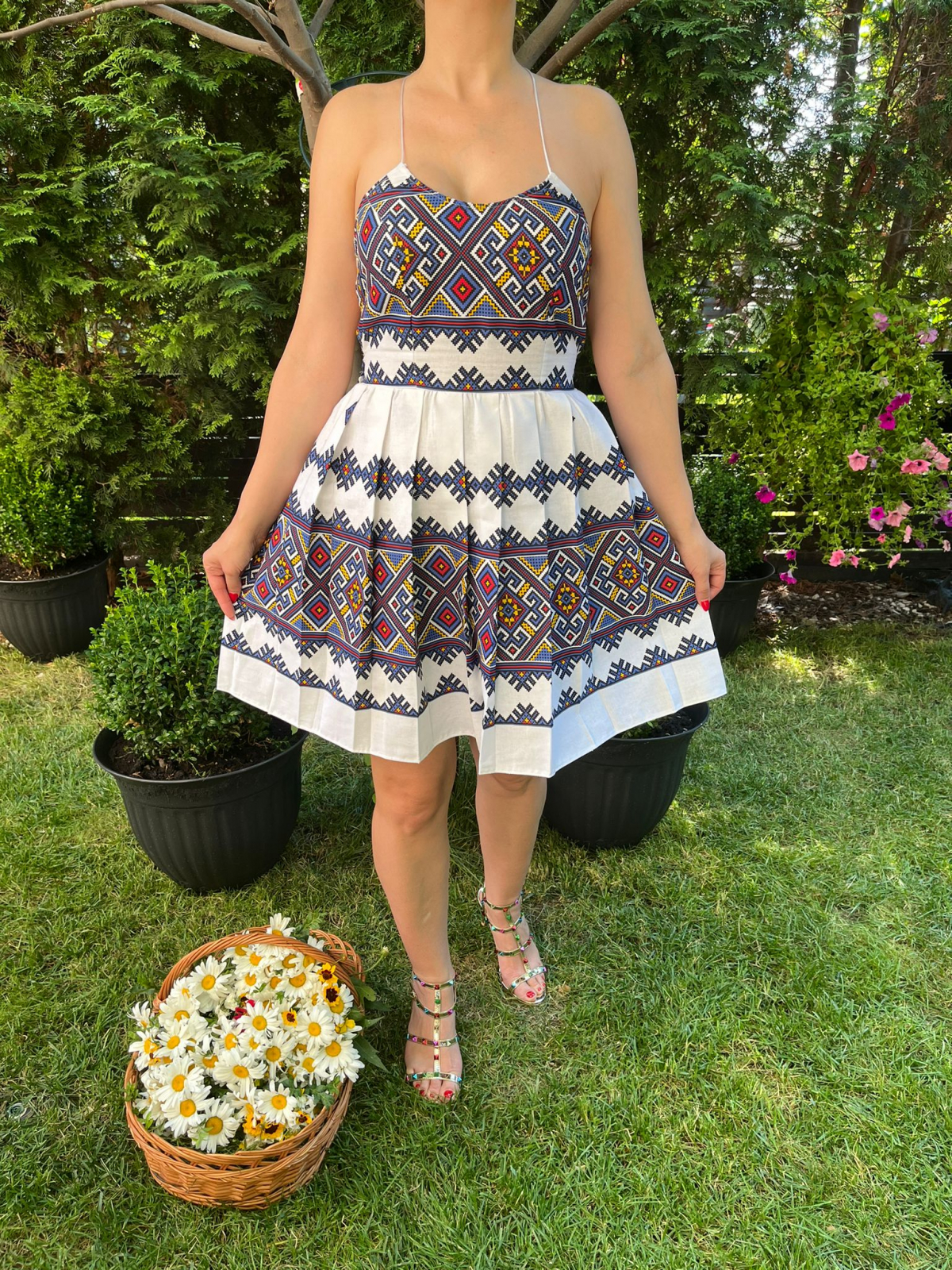 Rochie plisata din panza cu motive traditionale ale portului romanesc, potrivita pentru ocazi speciale.