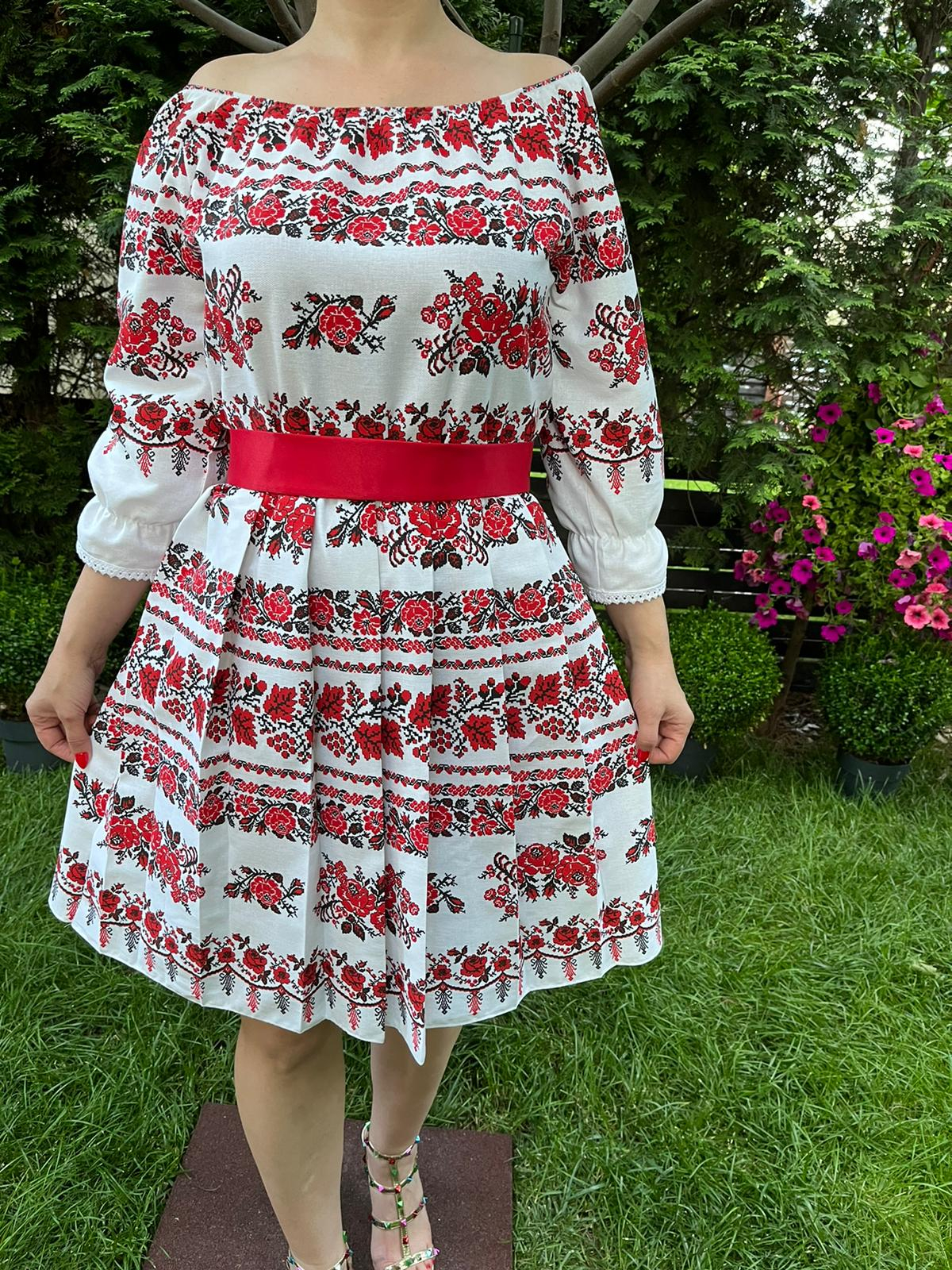 Rochie plisata din panza cu motive traditionale ale portului romanesc, potrivita pentru ocazi speciale.