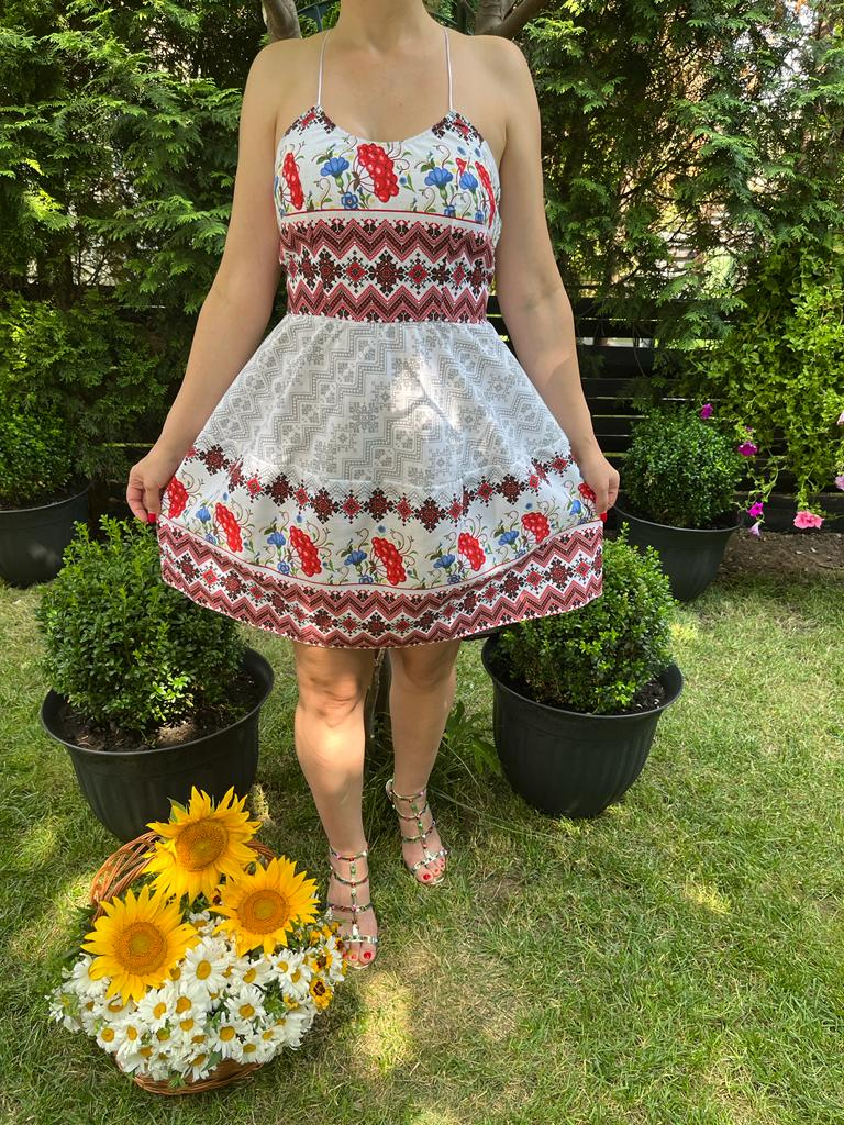 Rochie cu volane din panza cu motive traditionale ale portului romanesc, potrivita pentru ocaziile speciale.