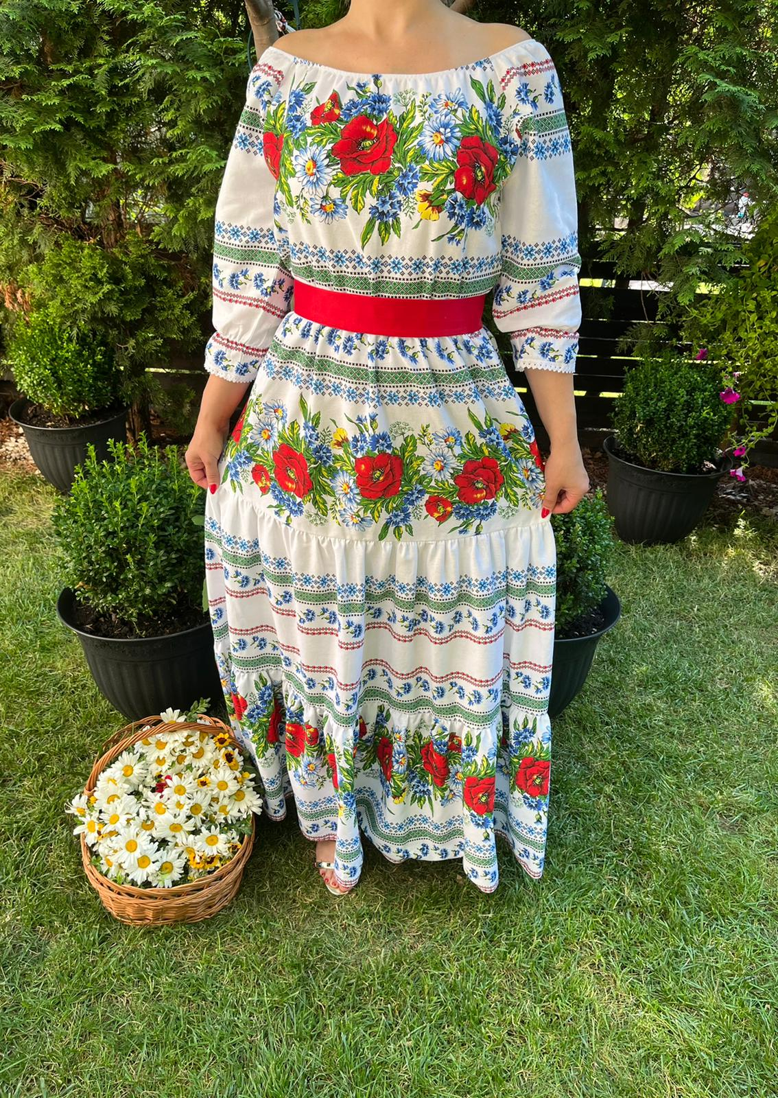 Rochie cu volane din panza cu motive traditionale ale portului romanesc, potrivita pentru ocaziile speciale.