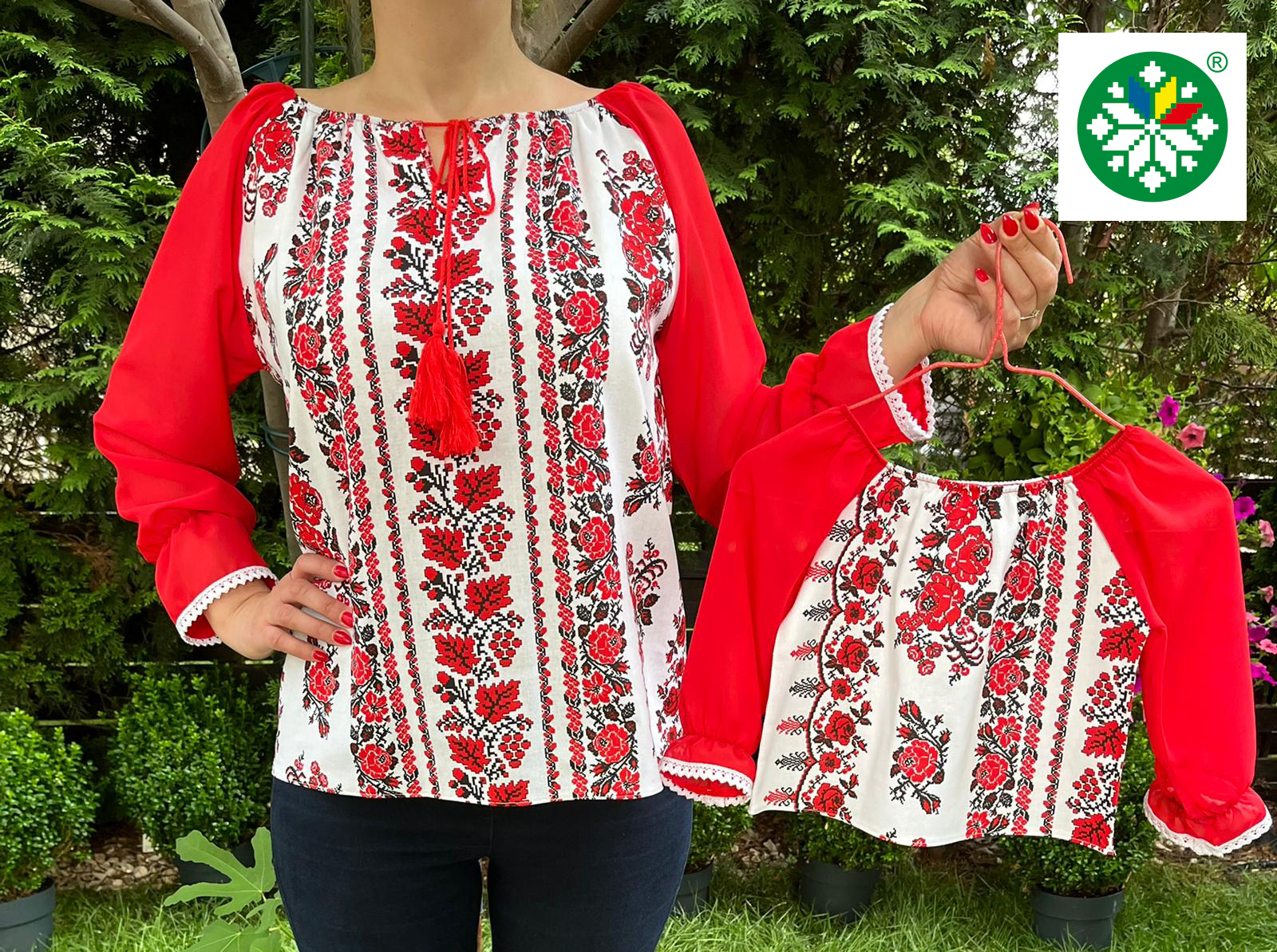Set ii mama-fica din panza cu motive traditionale ale portului romanesc.